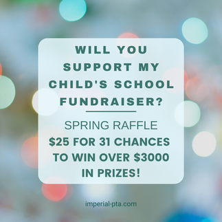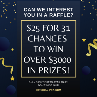 Due to California law we are unable to sell raffle tickets online so we'll be doing it the old fashioned way! Payment can be sent by cash or check made payable to Imperial PTA or if you stop by the PTA table after school we can accept credit cards, and very soon we'll be able to accept Apple an Google Pay!